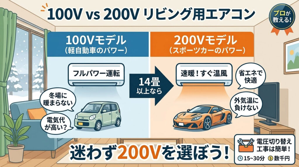 結論から申し上げます。 14畳以上のリビングなら、迷わず「200Vモデル」を選んでください。 電圧変更工事の手間と費用(数千円程度)を払ってでも、それ以上の「快適さ」と「省エネ効果」が確実に返ってきます。