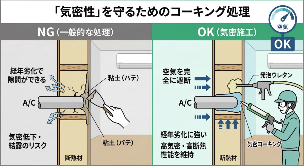 一般的な粘土(パテ)で埋めるだけでは、経年劣化で隙間ができ、そこから隙間風が入ってきます。 一条工務店の高い気密性を維持するためには、「発泡ウレタン」や「気密コーキング」を穴の奥まで充填し、空気の通り道を完全封鎖する必要があります。