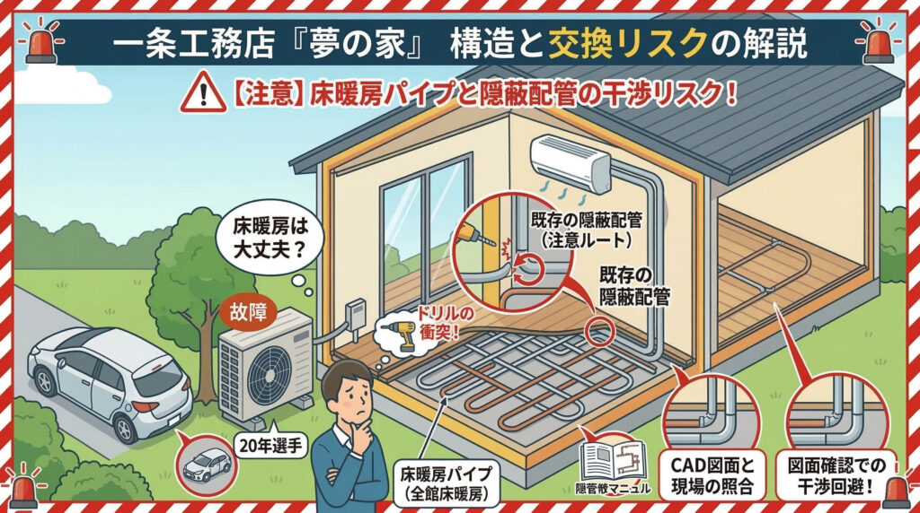 一条工務店の「夢の家」エアコン交換|床暖房パイプを避けて隠蔽配管を再利用するコツ