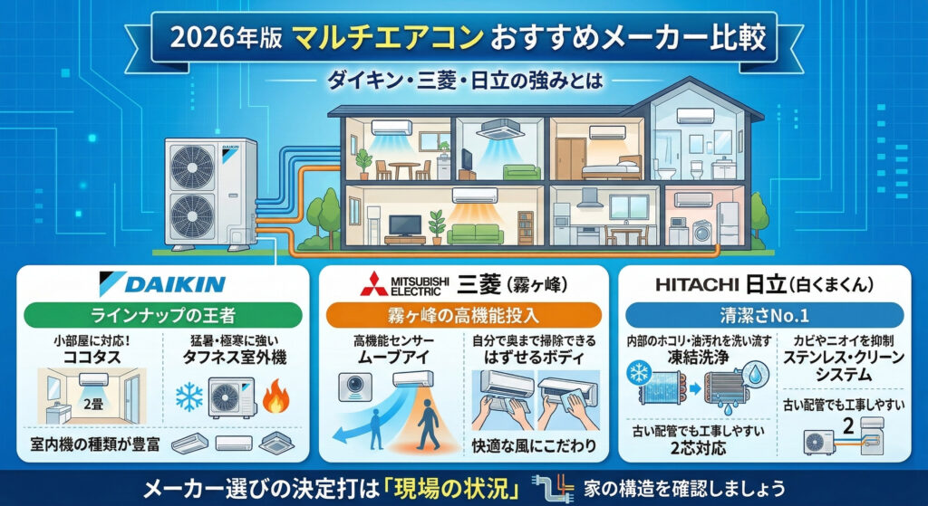 【2026年版】マルチエアコンのおすすめメーカー比較|ダイキン・三菱・日立の強みとは