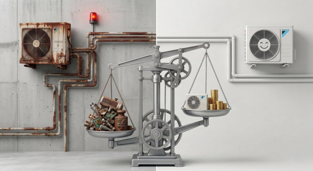 この条件さえクリアできるなら、今後のメンテナンス性やコストパフォーマンスを考えて、通常のエアコンへの切り替えを強くおすすめします。