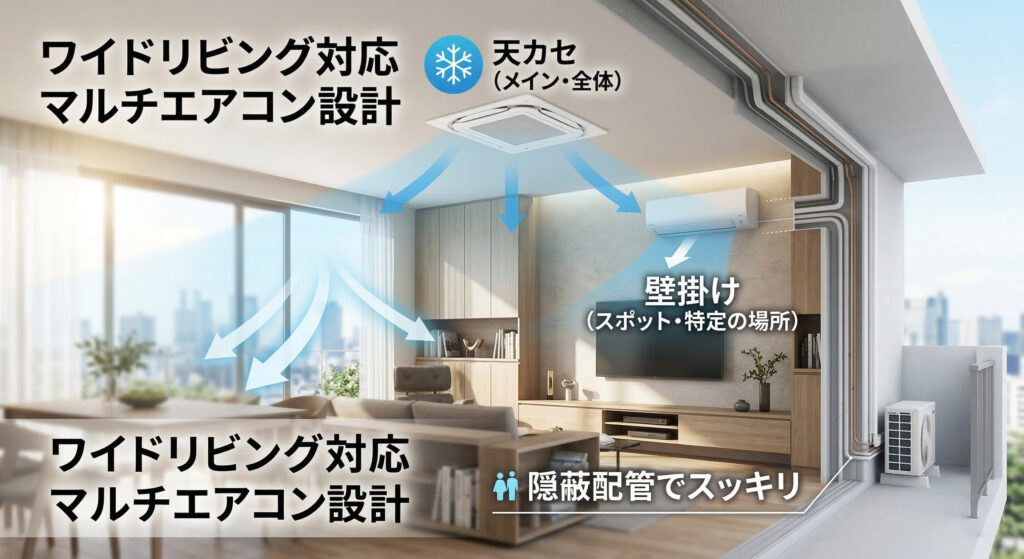 ワイドリビングに最適!マルチエアコンで「天カセ+壁掛け」を組み合わせる空調設計